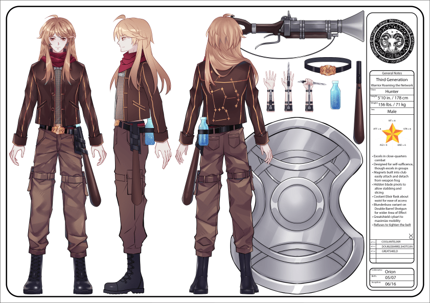 Orion is an ex-fast food wage slave turned action hero after being called to serve a greater purpose under the Persons Leading Extensive Investigation Across Daemon-Enthralled Space (PLEIADES). PLEIADES was formerly a top secret organization that was formed in response to the formation of Daemon-Enthralled Space (DES), an infinitely expanding cyberspace. It comes with boundless potential but equally dangerous threats. To better understand this, Warriors Roaming the Network (WRNs) like Orion were created to serve various purposes. Some perform research for new developments, others lead exploration projects and miner class WRNs collect gemstones called Binary Diamonds for further research.